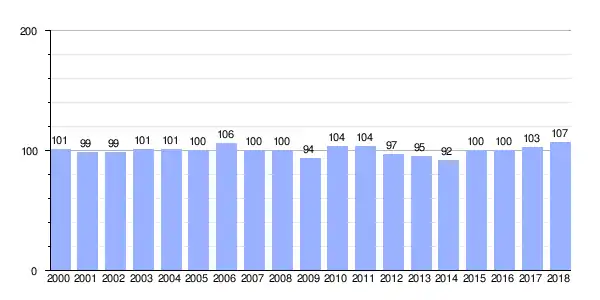 | Gráfica de evolución demográfica de Tatín entre 2000 y 2018 |