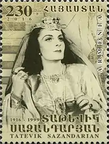 Tatevik Sazandaryan (1916-1999), fue una mezzosoprano de ópera soviética y armenia que se convirtió en miembro del Sóviet Supremo de la Unión Soviética en 1958. Actuó como solista en el Teatro de la Ópera de Ereván de 1937 a 1961.[1]