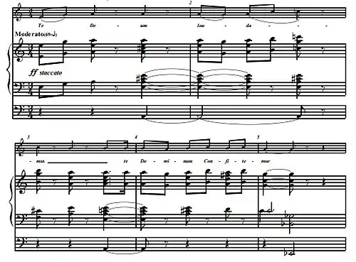 Utiliza dispositivos de composición estándar tales como ostinati, tonos de pedal, inversión melódica, y relaciones interválicas de cuartas, quintas y octavas. Sin embargo, mezcla estos elementos más tradicionales con tonalidades policromáticas, pasajes altamente cromáticos, progresiones armónicas no funcionales de acordes paralelos y relaciones tritonales. Para toda su ambigüedad armónica y tonal, la pieza comienza y termina con E, expresada en octavas en la medida I, y concluyendo con un acorde E-M inalterado. Debido a que E no se toniciza en ninguna forma tradicional, ya sea al principio o al final de la pieza, funciona como un marco, o una señal sonora de que la pieza ha llegado a su conclusión. Construida en varias secciones, la pieza puede ser entendida como una introducción, seguida de una forma tripartita. Te Deum es en consecuencia, una exitosa fusión de lo antiguo y lo contemporáneo.[5]