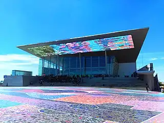 Se sitúa en la cabecera sur del parque y dada su posición, actúa como remate visual del mar de colores, efecto realizado por el mosaico Homenaje a la Mujer del Mundo de Byron Gálvez Avilés.[5][6] De ahí, la idea de reflejar el mosaico a través de una gran cubierta reflejante de parteluces de cristal espejo, dispuesta a 25 metros de altura y con un volado en sus dos extremos de casi 40 metros.[5][6] Fue posible orientar los elementos reflejantes de la cubierta sin ocasionar ningún reflejo solar.[5][6]