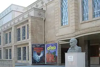 ![]() El edificio del teatro en 2015. En primer plano hay un busto de Sabit Rahman. | ||