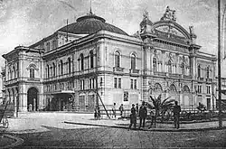 Proyecto de los comerciantes de Bari,[2] Onofrio y Antonio Petruzzelli realizado por Angelo Cicciomessere con frescos de Raffaele Armenise (destruidos en el incendio) se inició su construcción en1898 inaugurándose el 14 de febrero de 1903 con Los Hugonotes de Giacomo Meyerbeer.