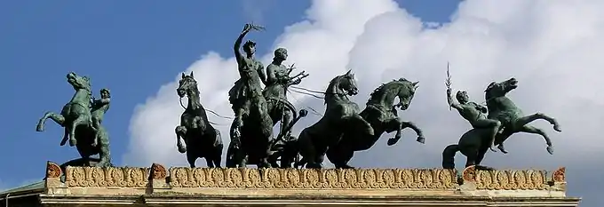 La entrada está constituida por un arco de triunfo coronado por la cuadriga de bronce de Apolo, obra de Mario Rutelli, acompañada por una copia de caballos de bronce de Benedetto Civiletti.