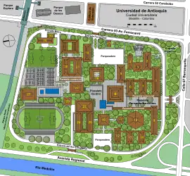 - Vicerrectoría de Docencia. «Informe de Autoevaluación Institucional 1997-2001 - Universidad de Antioquia (Factor 9: Recursos de Apoyo Académico y Planta Física.)» (PDF). Archivado desde el original el 26 de abril de 2012. Consultado el 26 de diciembre de 2007. «Información general de la Universidad».