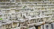 ̟Los asientos eran de piedra; los preferentes (proedia) tenían respaldo y brazos. Los demás carecían de respaldo y su parte frontal era hueca para que sus ocupantes pudieran echar los pies para atrás para cuando otros espectadores pasaban frente a ellos. Estos asientos medían unos 75 cm de ancho y su altura oscilaba entre unos 33 cm en el primer piso y unos 43 en el segundo.[6]