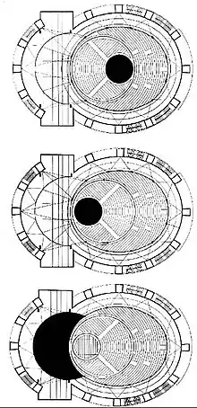 La escena se plantea a partir de dos figuras geométricas básicas como la elipse y la circunferencia y en esta fase se plantea la relación entre ambas figuras para darle al proyecto la flexibilidad total mediante una ingeniosa rotación mecánica del círculo central del auditorio.[1] De este modo, mediante un sencillo movimiento, se consigue cualquiera de las tres disposiciones teatrales anteriormente enunciadas: el teatro central, el circular y el de proscenio.