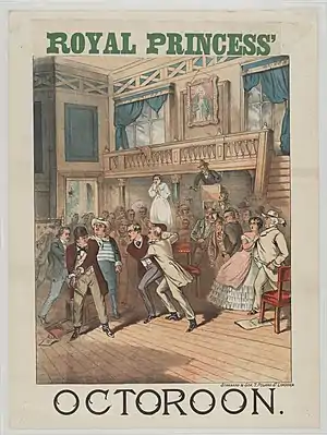 Dion Boucicault (1820-1890), autor y actor de gran sagacidad e intuición de lo que esperaba el público, supo aprovechar hábilmente las corrientes y posibilidades dramáticas que se hallaban en el ambiente y, adoptando y adaptando escenas, situaciones y frases de dramaturgos o novelistas franceses e ingleses, tuvo el acierto de proporcionar a sus oyentes algo brillante con visos de originalidad. Se le atribuyen 145 dramas, entre los cuales destacan Los hermanos corsos (1852), Luis XI, rey de Francia (1855), Rip Van Winkle, o un sueño de veinte años (1865) y otros, de tema irlandés, como La doncella pura (1860) y The Shaughraun (1874), que influyeron[11] en autores posteriores. De origen franco-irlandés,[11] en marzo de 1841, bajo el seudónimo de «Lee Morton»,[95] alcanzó un gran éxito con London Assurance, drama representado en el Covent Garden.[11] La trama era sencilla, pero ingeniosa; abundaba en situaciones cómicas; los diálogos eran vigorosos y enérgicos; no carecía de ingenio, y había tal vez más que suficientes de esas ligerezas y agradables impertinencias que el espectador medio prefiere al ingenio.[96] Sigue siendo considerada a día de hoy una de las mejores obras de teatro de su tiempo, y resulta una obra extraordinaria para un hombre tan joven.[95] Su rotundo éxito condicionaría su carrera. Desde entonces ha seguido siendo una de las favoritas de los aficionados británicos y estadounidenses.[96][Nota 34] De inmediato continuó con una serie de otras obras[98] exitosas. En febrero de 1842 llevó al citado teatro, con su nombre real, La heredera irlandesa, y el 19 de septiembre al Haymarket Alma Mater, or A Cure for Coquettes. Siguieron Woman en el Covent Garden (2 de octubre de 1843) y Old Heads and Young Hearts en el Haymarket (18 de noviembre de 1844).[95] Al Princess's Theatre llevó Los hermanos corsos, Luis XI y Fausto y Margarita, y al Adelphi Prima Donna, Janet Pride, Genevieve y otras ingeniosas adaptaciones.[95] De 1853 a 1859 estuvo en los Estados Unidos, donde siempre gozó del favor del público. A su regreso a Inglaterra produjo en el Teatro Adelphi una adaptación dramática de la novela The Collegians (Los universitarios), de Gerald Griffin,[Nota 35] titulada The Colleen Bawn[98] (1860). Esta obra, una de las más exitosas del período moderno, se representó en casi todas las ciudades del Reino Unido y de los Estados Unidos, y generó para su autor una considerable fortuna, que perdería en la gestión de varios teatros de Londres;[98] incluso fue traducida al francés, y puesta en escena en el Teatro del Ambigu de París. Boucicault produjo con posterioridad en el Adelphi[96] otro drama "sensacionalista",[96] The Octoroon (El mulato, 1861), cuya popularidad llegaría a ser casi tan grande[98] como la de The Colleen Bawn. The Dublin Boy (Le Gamin de Paris) fue puesta en escena el 10 de febrero de 1862, y La vida de una actriz el 1 de marzo. Dot (El grillo del hogar) estuvo en el Adelphi (14 de abril de 1862) y The Relief of Lucknow en el Drury Lane, del que fue gerente durante un tiempo.[95] En 1864 el Teatro Saint James programó su Fox Chase, y el Princess's Theatre The Streets of London.[95] El siguiente éxito notable de Boucicault[98] fue Arrah-na-Pogue, estrenada primero en Dublín;[95] posteriormente fue llevada al Princess's Theatre (22 de marzo de 1865), y traducida y representada en francés y otras lenguas.[95] The Colleen Bawn y Arrah-na-Pogue han eclipsado un tanto sus producciones anteriores, y el público se inclina a considerarlo como un escritor únicamente de melodramas.[97] The Parish Clerk (El sacristán), escrita para Joseph Jefferson, fue llevada a Mánchester; The Long Strike, al Lyceum; The Flying Scud estuvo en la inauguración del Holborn Theatre; Hunted Down, en el Saint James; After Dark (1868) y Presunta evidencia, en el Princess's Theatre, y Formosa en el Drury Lane. En 1870 llevó al Princess's Theatre Paul Lafarge, A Dark Night's Work y The Rapparee, y al Holborn Jezabel.[95] Seguirían Led Astray en 1874, y The Shaughraun en el Drury Lane en 1875.[95]