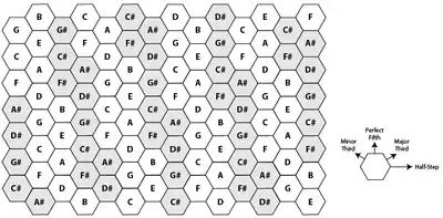 A pesar de existir un gran número de disposiciones isomórficas de notas, la tabla armónica resulta especialmente inusual por la contigüidad de ciertos intervalos musicales según la orientación en la que se desplace por los diferentes ejes del teclado que determinan los hexágonos o notas. Así se tendrá en: