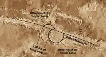 Además, investigaciones recientes afirman haber encontrado la primera evidencia fuerte de la tectónica de placas en Marte.[4] Este descubrimiento se refiere a una zona de falla de ataque a gran escala en el Valles Marineris a través del sistema, que se ha comparado con la transformación de fallas en la Tierra como las fallas de San Andreas y el Mar Muerto. Este descubrimiento podría tener importantes implicaciones para nuestra comprensión futura de la tectónica marciana.