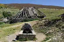 - Cabañas rectangulares de piedra y cubierta vegetal de escoba y paja, con el establo en la parte de abajo y el pajar arriba. Es la distribución de casa-establo de las pallozas descritas. Están construidas en terreno en desnivel, abriéndose un hueco en la parte alta de la pendiente para poder meter el heno. Se accede al piso de arriba por escalera de mano rústica; en algunos casos se ha construido un patín o escalera exterior.