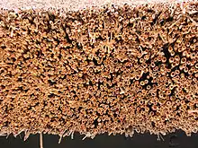 - Sujeción con tuerus. Los tuerus son cortezas de haya que protegen el cume o caballete de la cima.
