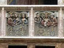 La balaustrada del segundo piso está decorada con ocho relieves, seis de frente a la plaza y dos flanqueando, relatando varios momentos de la vida de Maximiliano.[1][2] Los dos relieves centrales muestran a Maximiliano. El izquierdo muestra al Emperador con su segunda mujer Blanca Maria Sforza, que tiene una manzana en la mano, y a su amada primera mujer María de Borgoña, a la derecha.[4] El otro relieve central muestra al Emperador con bufón y su canciller.[2] Los relieves laterales muestran bailarines moros en "bailes acrobáticos y grotescos"—una diversión popular de aquel tiempo. La danza mostrada en estos relieves exteriores es de origen andaluz.[2]