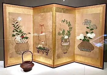 En el kakemono (rollo colgado) Flores de otoño en una cesta de bambú, el artista de la escuela Nanga, Yosa Buson (1716–1783) pintó un ramo de flores de otoño de pie en una cesta de bambú de estilo chino con un mango redondeado. Las flores representadas son crisantemos (kiku), campanillas chinas (kikyō) y malvas de rosa (fuyō), y están en plena floración en otoño. Por lo tanto, todos están asociados en la poesía tradicional japonesa de esta estación del año. El artista utilizó una técnica llamada sumi-nijimi, o «desenfoque de tinta», para resaltar las flores. Aplicó pinceladas en la superficie de los lavados de tinta antes de que se secaran, creando un efecto de textura suave. Para la textura de la cesta de bambú trenzada, utilizó pinceladas horizontales cortas en tinta oscura para contrastarla con las flores evocadoras.[117]
