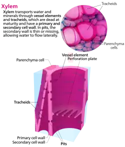 Las células más características del xilema son los largos elementos traqueales que transportan el agua. Las traqueidas y los elementos de vasos se distinguen por su forma; los elementos de vaso son más cortos, y están conectados entre sí en tubos largos que se llaman vasos.[5]