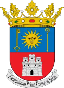 Escudo cortado: primero, de azur, el sol, de oro, acompañado de llave y báculo del mismo metal; segundo, de gules, el castillo de plata. Al timbre, el lema, de plata y con letras de sable, «Fortunatarum prima civitas et sedes» y corona real abierta.