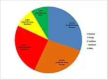 | Movistar (28.06 %) Orange (22.84 %) Vodafone (22.24 %) Yoigo (20.52 %) OMV's (6.34 %) |