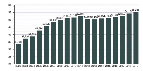 | Evolución del número de líneas de telefonía móvil en España en el periodo de 2002 a 2019 (millones de líneas) |