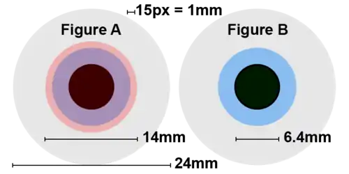 La resolución se deduce de la longitud de onda de la luz y de la apertura, expresadas en la misma unidad; donde 550 nm se transforman a mm según la expresión: .