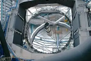 La mayoría de los grandes reflectores de investigación operan en diferentes planos focales, dependiendo del tipo y del tamaño del instrumento que se utilice. Estos incluyen los tipos de primer foco del espejo principal, de foco de cassegrain (la luz se dirige con un espejo secundario hacia detrás del espejo primario) e incluso con foco externo (como en la disposición acodada de Nasmyth).[23]