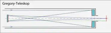 El telescopio gregoriano consiste de dos espejos cóncavos, el espejo primario (una paraboloide cóncava) recoge la luz y la lleva a un enfoque antes de que el espejo secundario (un elipsoide cóncavo), en donde se refleja a través de un agujero en el centro de la primaria y por lo tanto a través del extremo inferior del instrumento donde se puede ver con la ayuda del ocular. Como la elipse tiene dos focos, en uno de los focos se hace coincidir el foco de la parábola, y la imagen final queda en el segundo foco.