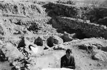 El primer equipo que excavó el yacimiento fue un grupo alemán dirigido por Ernst Sellin entre 1913 y 1914 bajo los auspicios del Imperio Otomano.[1] Su trabajo se vio interrumpido por la Primera Guerra Mundial, aunque Sellin lo volvió a retomar en 1926 y el equipo permaneció allí hasta 1934, dirigido en sus últimas etapas por G. Welter.[13] Sin embargo, gran parte de la documentación recopilada se perdió por los bombardeos aliados durante la Segunda Guerra Mundial.[1]