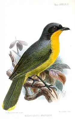 Mide unos 18 cm de largo. Su aspecto es variable y existen varios morfismos de diferentes colores. Todas las aves poseen sus partes inferiores verdes, siendo gris su corona y parte superior de la espalda, el extremo de la cola es amarillo y el pico y patas son negras. El morfismo anaranjado posee una máscara negra y partes inferiores anaranjadas, virando a un tono amarillo bajo la cola. El morfismo rojo es similar pero es rojiza su garganta y pecho con tonos de amarillo en el vientre y cuberteras en la cola. El morfismo negro posee cara, frente, garganta y pecho completamente negros, y su viente y cuberteras en la cola verdes. Las hembras poseen tonos más apagados que el de los machos con menos negro en la frente. El canto incluye tonos repetidosque se asemejan al tañido de una campana, las parejas a menudo cantan juntas
