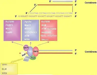 - Contribuye a la protección de los telómeros, inhibiendo la formación de puentes anafásicos, y evitando que los sistemas de reparación del ADN reconozcan erróneamente el saliente 3' como daño en el ADN.