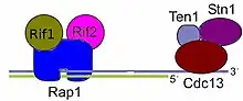 - Aunque en principio se creía que el complejo CTS y el basado en POT1 eran incompatibles, existen proteínas asociadas a telómeros en S. cerevisiae similares a la Shelterina, estas son Rif1, Rif2 y Rap1. Aparentemente, realizan las mismas funciones de inhibir la fusión de telómeros por NHEJ y la elongación por la telomerasa, así como el procesamiento nucleolítico de los telómeros en las fases del ciclo celular G1 y G2, es decir, la formación del saliente 3'.[59]