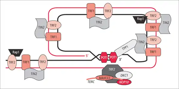 - TERF2 se puede unir a POT1. Esta unión no es necesaria para la función de protección de telómeros, pero aumenta la captación de POT1 por estos últimos.[46][48]