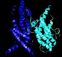 - TPP1 se une a POT1 por su extremo carboxilo. Esta unión es tan constante, y se observa una estequiometría in vivo tan próxima a 1:1, que con frecuencia se habla del "heterodímero POT1-TPP1".[42][43] Parece que esta interacción es necesaria para la localización de POT1 en telómeros, y así mismo para la regulación de la longitud de los mismos interactuando con la telomerasa conjuntamente.[44] Parece, asimismo, que estas dos proteínas pudieran derivar de una única ancestral, según se desprende del análisis de la proteína de unión a extremos teloméricos de ciliados.[45] Esta unión, además, inhibe la unión de RPA a las porciones de ADN en forma de cadena simple, lo que podría ser una señal errónea de daño.[46] Por último se ha visto que la unión de TPP1 a POT1 aumenta mucho la capacidad de discriminar el ADNss del ARN como sustrato de unión.[47]