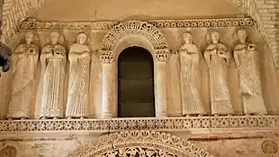 La parte más interesante es, sin embargo, el «fresco» del nivel superior, donde se superponen libremente los elementos arquitectónicos del edificio como las ventanas. Aquí se encuentran seis figuras en relieve de Santos, en estuco, excepcionalmente bien conservadas: sus figuras monumentales están relacionados con modelos clásicos, un contraste con la cultura lombarda. El ropaje de las prendas ricamente decoradas tienen una caída marcadamente rectilínea que recuerda a los modelos bizantinos,[1] de los cuales los Santos destacan por el mayor sentido del volumen y por el verticalismo, ulteriormente marcado por la longitud de los pliegues de las túnicas.[5]