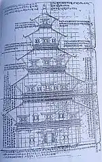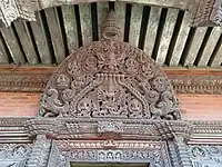 En cuanto al edificio principal, la estructura de estilo similar a una pagoda se asienta sobre una columnata que enmarca una pared interior de ladrillos. En la fachada, la columnata se posa sobre un arco festoneado y las uniones de la viga están ocultas por imágenes talladas de deidades. La cornisa de encima presenta una banda ondulada, sobre la cual sobresalen los extremos de las vigas a semejanza de tigres. Más arriba, una multitud de ménsulas de madera sostiene cada nivel del techo; por lo general, cada una da pie a una imagen de una deidad de múltiples brazos. Cada composición de este tipo fue una vez pintada con colores brillantes, pero en la actualidad solo se pueden discernir restos descoloridos del original.[15]