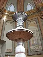 Por el lado de la epístola, justo a la entrada, se halla un baptisterio alto con cúpula, lo cierra un enrejado plano y calado que data de 1780. Le precede una capilla de nave sencilla con bóveda de cañón con lunetos y cúpula sin tambor.