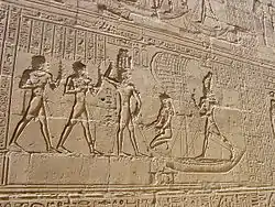 El templo de Edfu es el templo más grande dedicado a Horus y Hathor de Dendera.[2] Fue el centro de varias fiestas sagradas dedicadas a Horus. Cada año, "Hathor viajaba al sur de su templo en Dendera para visitar a Horus en Edfu, y este acontecimiento que marcaba el matrimonio sagrado era la ocasión para una gran fiesta y peregrinación".[7]