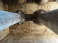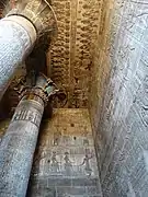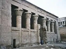 Es notable por la belleza de su emplazamiento y la magnificencia de su arquitectura. Fue construido con piedra arenisca roja y su pórtico constaba de seis filas de cuatro columnas cada una, con capiteles de hojas de loto, todos diferentes entre sí.[2] El templo contiene inscripciones jeroglíficas muy tardías, que datan del reinado de Decio (249-251).[3]