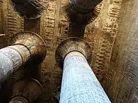 Auguste Mariette excavó una parte del templo: la sala hipóstila, situada en la entrada, la última en construirse. Los textos e imágenes grabados brindan detalles de las prácticas religiosas locales; allí están inscritos himnos a Jnum.