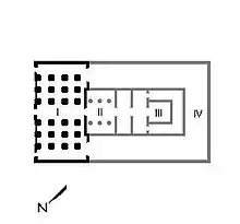 II: Sala hipóstila / III: Naos / IV: Galería.