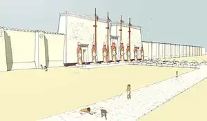 En las proximidades se ha descubierto la diada representando a Ramsés II de pie junto a Ptah-Tatenen.[Nota 4] La excavación de la pared del norte han puesto de manifiesto un espacio de casi treinta y cinco metros de ancho y once de profundidad, que encaja muy bien con el tamaño de un gran portal. Las bases de una puerta monumental y así como un dintel con el cartucho de Amenemhat III[8] confirmó al arqueólogo que era claro que Heródoto había visto la puerta. Al explorar el interior de la cámara en esta ubicación, Petrie vio a una columnata compuesta por cuatro filas de cinco columnas, de las cuales sólo quedan los cimientos de más de cuatro metros de espesor. Este portal debía formar una recepción en el patio.
