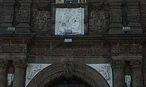 El templo fue consagrado, según Veytia a la Purísima Concepción de la Virgen y es a esta advocación la que se refiere la inscripción latina hallada en la clave del arco de la portada en una lápida oval, que reza: "Concepciotva dei genitrix Virgo gavdivm Annvnciavit Vniverso Mvundo Ex Te Enim Ortvs" (est sol iustitiae, Christus Deus noster) cuya traducción en castellano es: "Tu concepción Madre de Dios, anuncio alegría al mundo entero. Pues de ti nació (el sol de la justicia, Cristo nuestro Dios)" estando la inscripción incompleta.