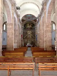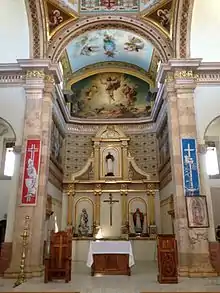 El interior está formado por tres naves, una central y dos procesionales de menor altura y sobre el nártex se encuentra el coro sostenido por un arco; la nave central está formada por una bóveda de cañón sostenida por cuatro arcos torales de cantera rosa hasta el crucero, donde junto con otros tres sostiene una cúpula de tambor octagonal sobre pechinas, los arcos torales se repiten de forma idéntica en las naves procesionales pero a menor altura y en los arcos formeros que dividen éstas de la nave central y que son coronados por una cornisa con detalles vegetales sobredorados. El ábside es cuadrado y de la misma altura de la nave central, cada una de las naves procesionales tiene en su cabecera una capilla.
