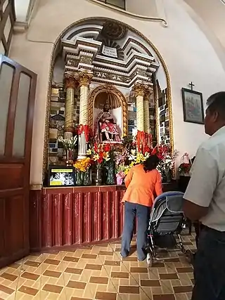 En el interior se resguardan valiosas obras del arte cristiano; uno de los espacios más visitados es la Capilla del Señor de Mayo, que contiene interminables placas de feligreses agradecidos por los favores recibidos. El retablo principal contiene al centro un tabernáculo cubierto con una cúpula, por encima se encuentra la imagen de Jesús Crucificado, el remate del retablo es un arco trilobulado, la mayor parte de la decoración es una combinación de detalles revestidos con pan de oro sobre fondo blanco y estilo barroco mestizo.