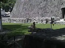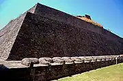 Costado norte de la pirámide que muestra parte del muro de serpientes.