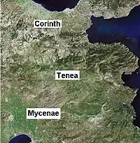 La antigua Tenea fue emplazada aproximadamente a 15 kilómetros al sureste de Corinto y a 20 km al noreste de Micenas, poco después de la guerra de Troya. La tradición decía que sus primeros habitantes eran prisioneros de guerra a los que Agamenón permitió construir su propia ciudad. De ahí que el nombre de Tenea recuerde al de Ténedos, su ciudad de origen y se venere especialmente a Apolo.[1] Otra tradición mítica señalaba que fue el lugar donde Pólibo crio a Edipo. Colonos de Corinto y Tenea en 734 a. C. o 733 a. C. bajo el liderato de Arquias fundaron la colonia conjunta de Siracusa en Sicilia.[2]