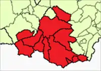 De forma triangular cuenta con una extensión de 1286, 2 km² y con una población 19886 habitantes.[1]
