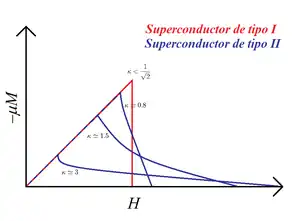 - si (especialmente, si ) entonces la energía superficial del superconductor es negativa y se trata de un superconductor de tipo II.