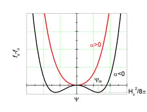 Como se puede observar en la gráfica adjunta, tomando β positivo y suponiendo que α sea negativo, habrá un rango del parámetro de orden para el cual la energía es inferior en el estado superconductor.