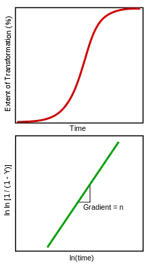 Las transformaciones suelen comúnmente seguir un característico perfil en S o sigmoidal, donde la velocidad de transformación es baja en el comienzo de la misma y al finalizar, pero rápida en los estadios intermedios. La baja velocidad inicial se explica por el tiempo necesario para que un número significativo de partículas formen núcleos de la nueva fase lo suficientemente grandes y estables como para poder crecer. Durante la fase intermedia la transformación es rápida: los núcleos, numerosos y de tamaño suficiente, comienzan a crecer consumiendo la antigua fase, al tiempo que nuevos núcleos continúan formándose en la fase antigua. Sin embargo, cuando la transformación está a punto de concluir, existe tan poca fase no transformada que los núcleos que puedan formarse o crecer a expensas de la misma es mucho menor; esto provoca que el crecimiento de la nueva fase se ralentice.
