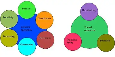 En su teoría del desarrollo cognitivo, Jean Piaget propuso que los seres humanos progresan a través de cuatro etapas de desarrollo: la etapa sensoriomotora, la etapa preoperacional, la etapa operativa concreta y la etapa operativa formal.[23]