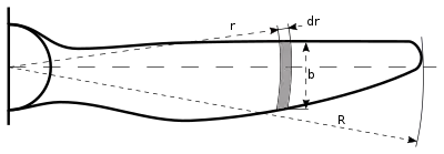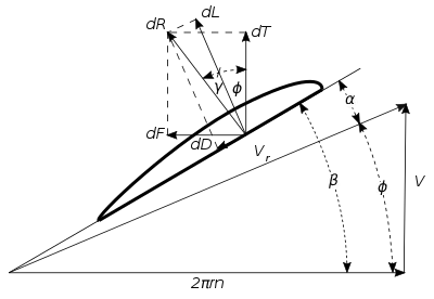 Consideremos el elemento de radio r, representado en la Fig. 1, que tiene la longitud infinitesimal dr y la anchura b. El movimiento del elemento en una hélice de avión en vuelo sigue una trayectoria helicoidal determinada por la velocidad de avance V del avión y la velocidad tangencial 2πrn del elemento en el plano del disco de la hélice, donde n representa las revoluciones por unidad de tiempo. La velocidad del elemento con respecto al aire Vr es entonces la resultante de las velocidades de avance y tangencial, como se muestra en la Fig. 2. Llamemos Φ al ángulo entre la dirección de movimiento del elemento y el plano de rotación, y β al ángulo de la pala. El ángulo de ataque α del elemento respecto al aire es entonces .