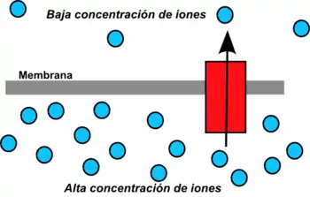 Un gradiente iónico tiene energía potencial y puede ser usada para efectuar reacciones químicas cuando los iones pasan a través de un canal iónico (rojo)